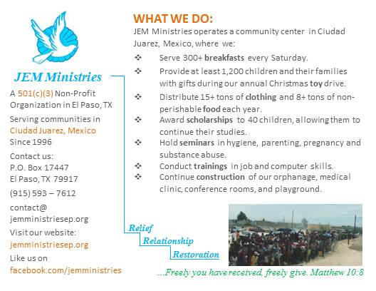 If you are in the El Paso / Juarez / Las Cruces area, we will come and share our vision and journey.
